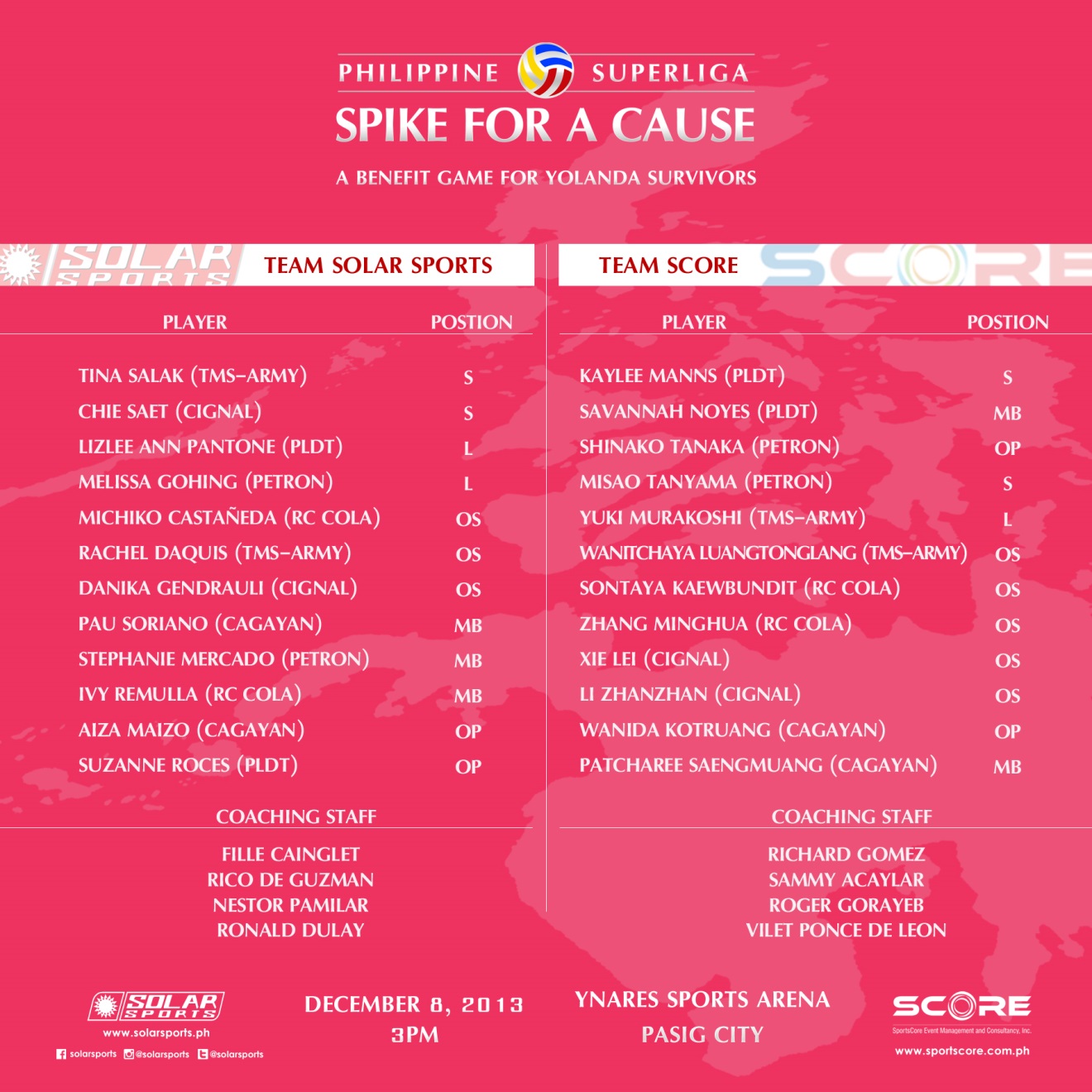 In an effort to raise donations and resources for those affected by Typhoon Yolanda, Solar Sports and Sports Core have organized Spike for a Cause: A benefit game for Yolanda survivors, which will take place on December 8 (Sunday) at 4:00PM at the Ynares Sports Arena in Pasig City.