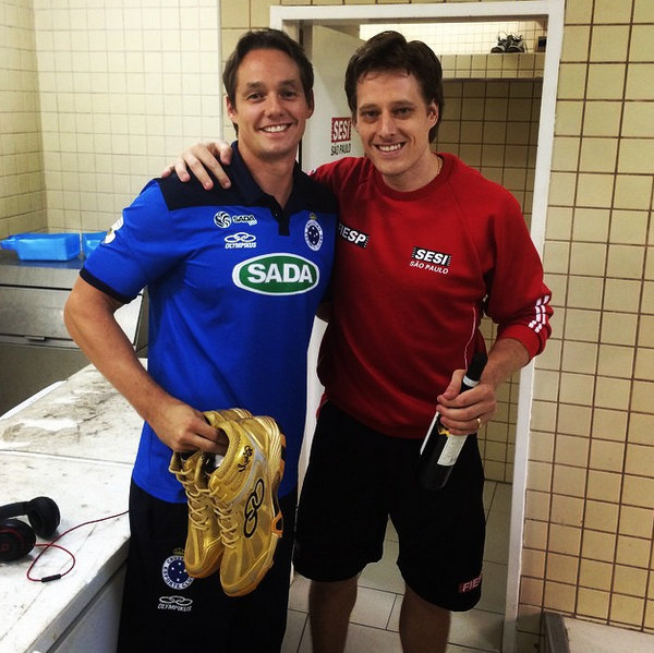 unfortunately we lost last night to #sesi but i didn’t come home empty handed! thanks to @edercarbonera, @wallaceleandro08, and @arjonaw7 for helping to broker this exchange and thanks to murilo for the generosity. #goldshoes #olympikus #campeão #murilo