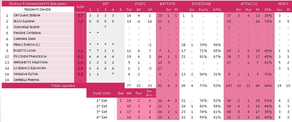 Norda Foppapedretti Bergamo: 4 Vasileva, Arrighetti 9, 14 Ortolani, Piccinini 19, Nucu 19, White 1, Merlo (L), L. Bosetti 11.