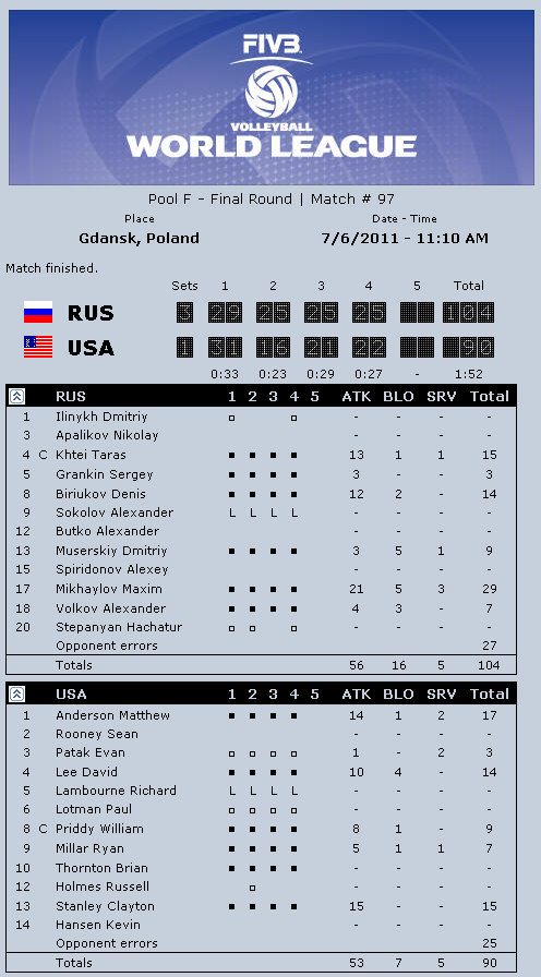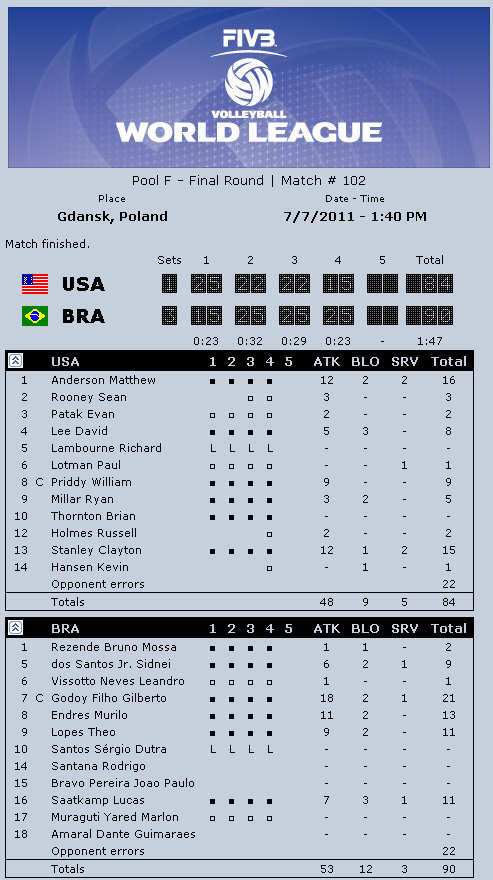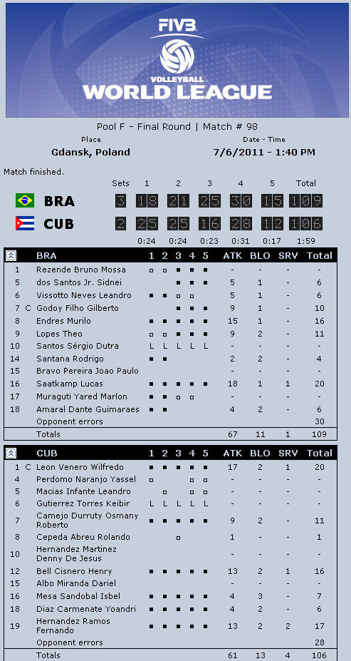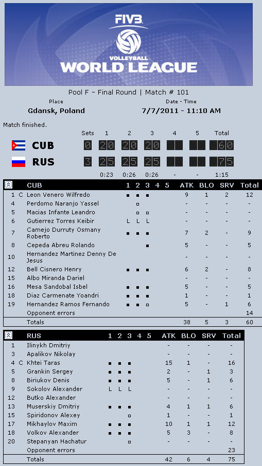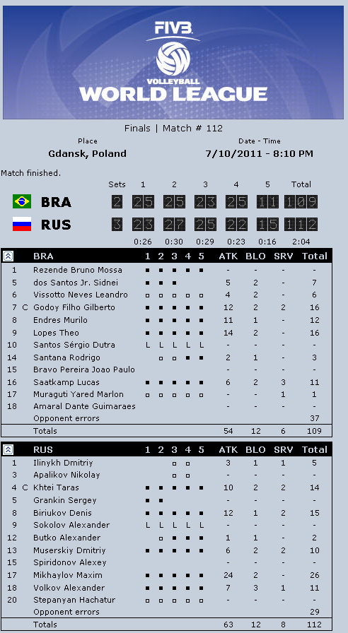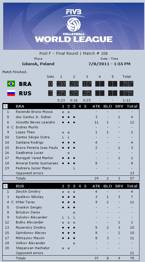 Brazil captain Gilberto Godoy Filho (Giba): “It was a great match, a real spectacle for everybody. It was one of the most exciting matches in last few years. Now we have to understand what happened and focus on qualifying for the Olympic Games and the South American Championships. I am proud of my team and I can promise you more from them. Russia played really well. The Russian school is amazing, it is not only power but also smart play. They played great in block and had one great service.”