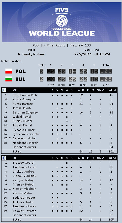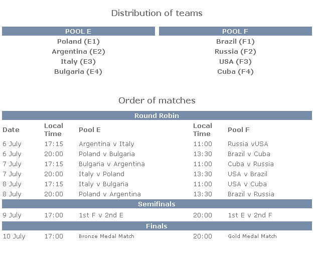 The Final Round will be held in the P9lish city of Gdansk from July 6th – 10th, 2011. Pool E is consist of host Poland, Italy, Argentina and Bulgaria while defending champs Brazil, USA, Cuba and Russia are in Pool what the F aka “The Pool of Death”.