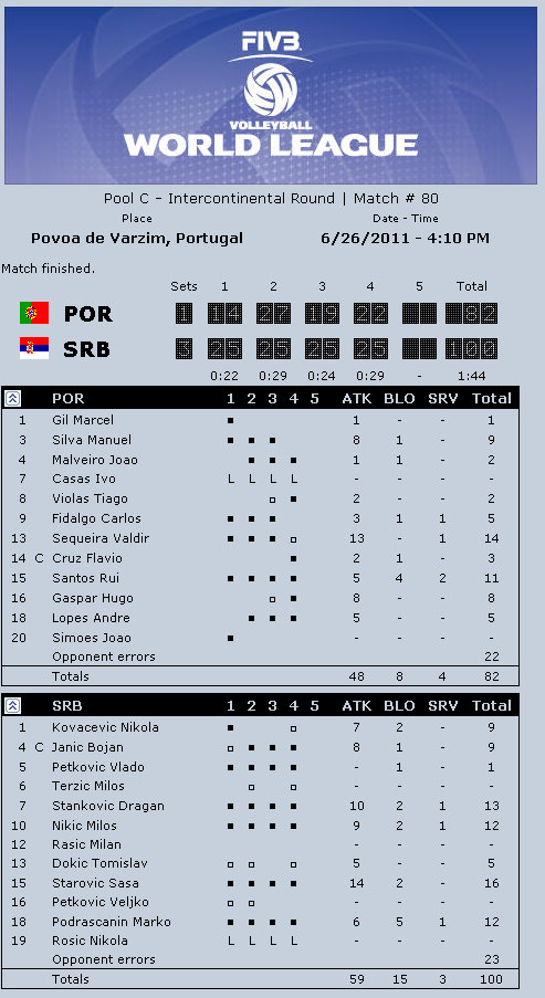 Note: Match #1 Stats and Results for SRB vs POR is unavailable but Serbia won in 5.