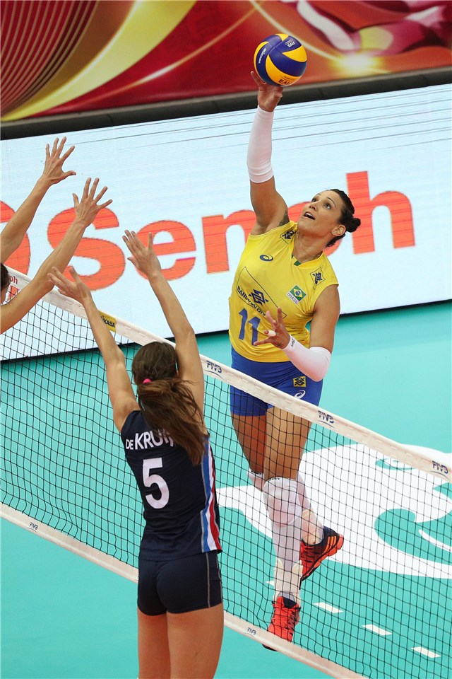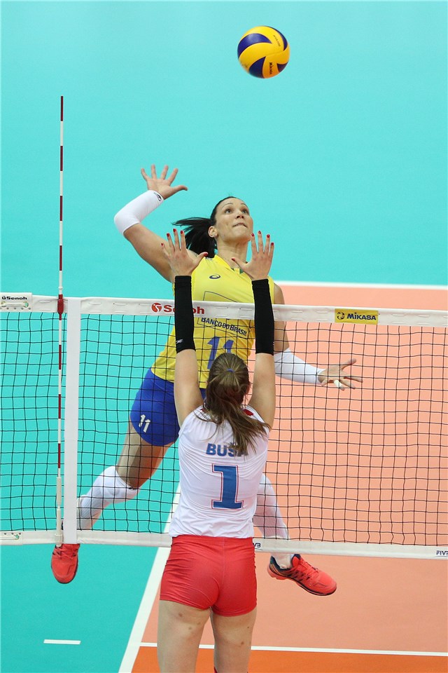 Brazilian opposite spiker Tandara Caixeta led her team to beat Serbia in the FIVB Grand Prix semifinal match scoring 24 points.