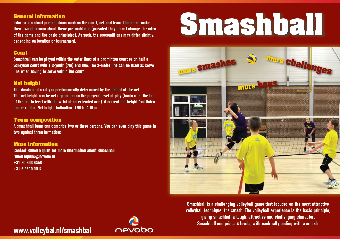 Smashbal, a new volleyball game for young boys and girls, is quickly gaining ground in the Netherlands. The game has four levels and each rally ends with volleyball’s most attractive and challenging technique – the smash.