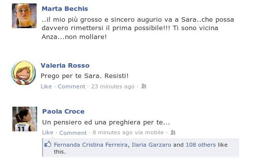 Translation by Verena G: Sara was such in a severe condition that she needed an emergency liver transplant. The surgery has been successfully completed. the first 48 hours after the operation went in the best possible way and there are encouraging signs of recovery. In the following 48 hours, doctors will be able to carry out a more in-depth evaluation. Prognosis is still reserved.