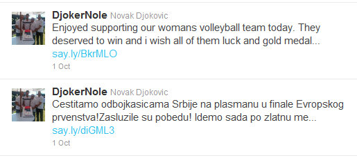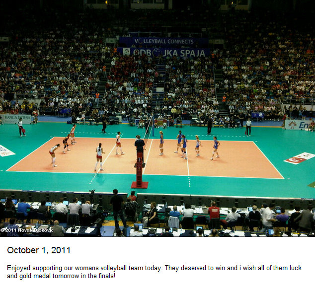 Last Saturday, Novak attended the semifinal match of the 2011 Women’s European Championship between his home team Serbia against Turkey. The match lasted for 2 hours yet Novak stayed to witness how his fellow Serbian athletes fought from set 1 until the very last point in the 5th set.
