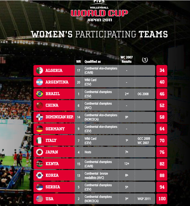 The FIVB Volleyball Women’s World Cup returns in 2011, marking the first step in the qualification proces for the London 2012 Olympic Games. The tournament will run from November 4 to18 and will see the top three teams qualify for the Olympics. They will join Great Britain as they have already secured a berth as the host country.