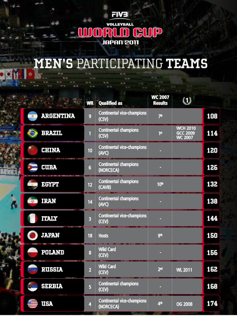The FIVB Volleyball Men’s World Cup returns in 2011, marking the first step in the qualification proces for the London 2012 Olympic Games. The tournament will run from November 20 to December 4 and will see the top three teams qualify for the Games. They will join Great Britain as they have already secured a berth as the host country.