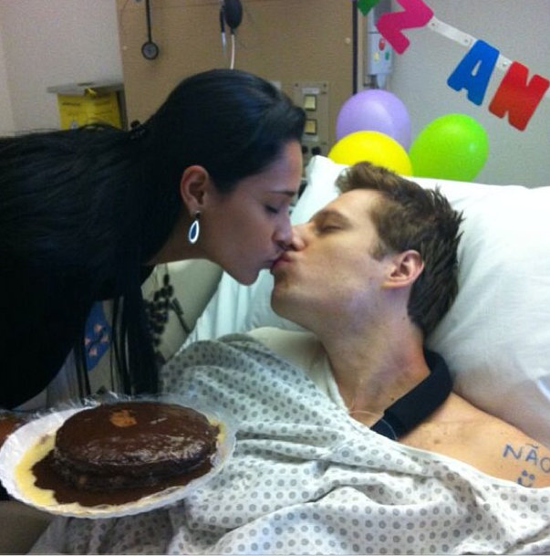Bigger smiles were seen on his face after the procedure when his gorgeous wife surprised him with a kiss, a cake and a mini party in his hospital room.
