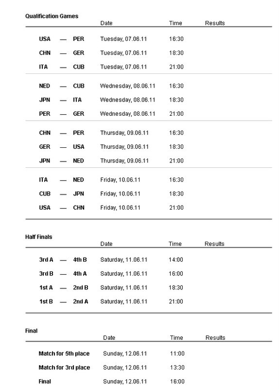 Last year’s silver medalist USA is in Pool A together with Germany, Peru and 2010 Volley Masters Champion China. While Pool B is composed of Cuba the 2010 bronze medalist, Japan, Italy and The Netherlands.