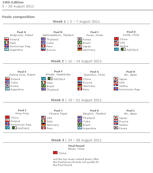 2. Due to the nuclear crisis, the Japanese Volleyball Federation will decide if they could host the Grand Prix that’s why the Pool Schedule says “TBD” for Japan.
