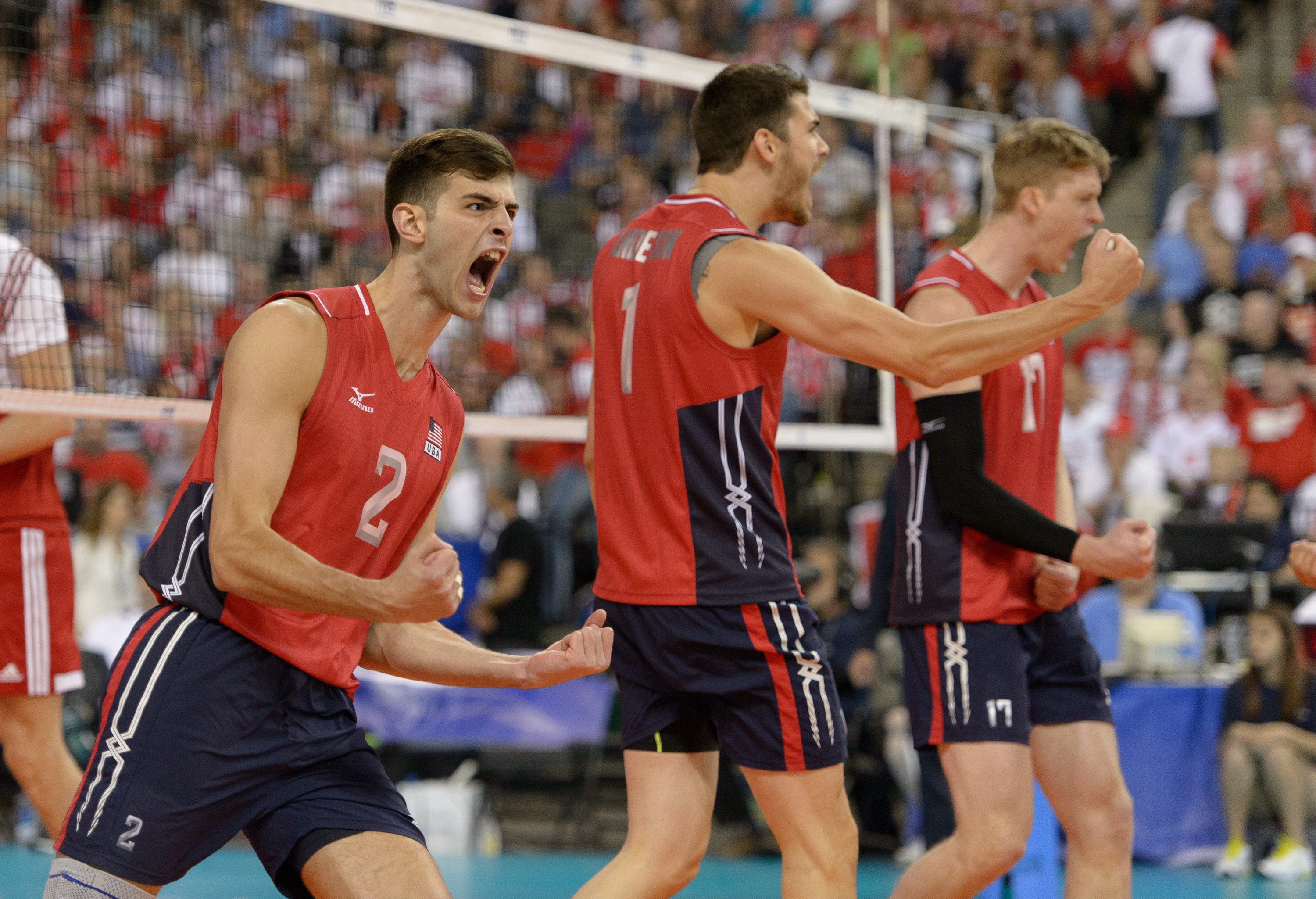 Hoffman Estates, IL, USA, June 12, 2015:  USA’s Aaron Russell (2) during a FIVB Men's Volleyball World League match between the United States and Poland at the Sears Centre Arena. Photographer: Daniel Bartel