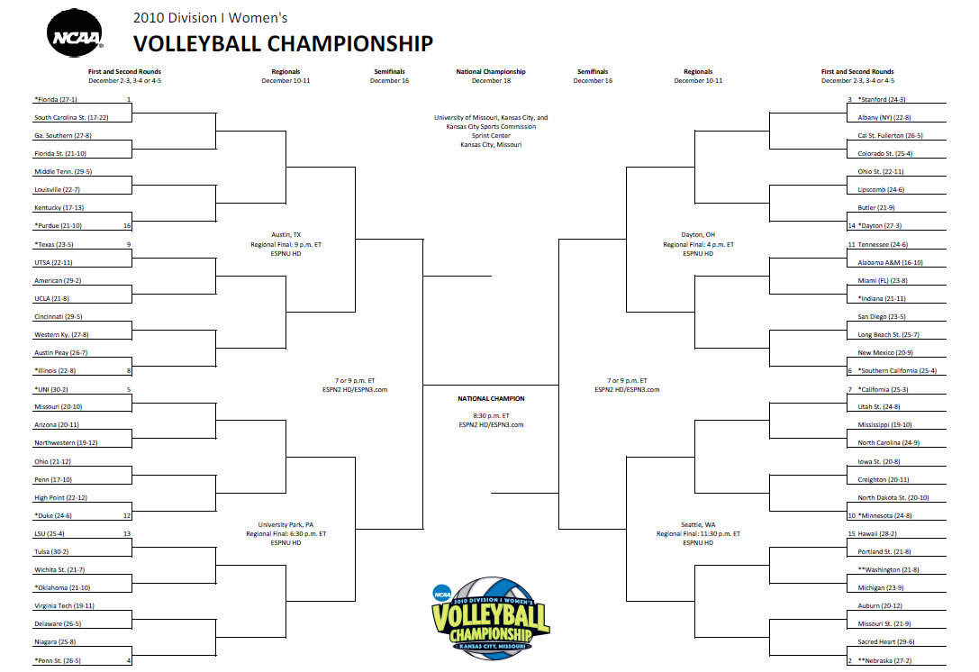Onto the #2 seed Nebraska. Oh faithful read Cornhuskers. You got a little shafted this time around, and honestly, kind of about time! Cook doesnt like to leave home; he likes to protect his girls. Well, its now time to step up or shut up! This has to be the toughest Region this time around. Did the committee get this one right? NO! Nebraska is good – dont get me wrong, but I could certainly see them being beaten. Once again rounds one and two are easy. No major test there, however, round three could pit them against the likes of Hawaii, Washington, and/or Michigan. You talk about being jacked! All four teams can beat anyone on any given night, but then again, thats the best part about sports. Michigan will have to be completely ON to get out of their first round match up against UW. Their passing will have to be nails, and the ball must go to more than just Hunt. This is a different team that made a great run last year out at Maples. If UW wants to win and move onto the second round, they will have to be consistent. Houston we have a problem? That seems to be one of their downfalls all season long. Can the freshman OH step up? Good ole’ Hawaii fans…your Bows certainly shot themselves in the foot this year. In ’09 they certainly had something to gripe about, but its a different tune this year! Losing to Utah State…well, enough said! Hopefully they will be fired up to make a run and prove themselves, because this regional will be a dog fight. Back to the Cornbots. Fine, the Cornhuskers. You’re good; I will give you that, but certainly beatable! Unfortunately, the way the year has gone, several teams have been lucky moving up in the ranks. If Nebraska can also remain consistent, fire from pin to pin, and block some balls, they could surely find themselves in the Regionals. Against whom you might ask? Well there is our next victim.