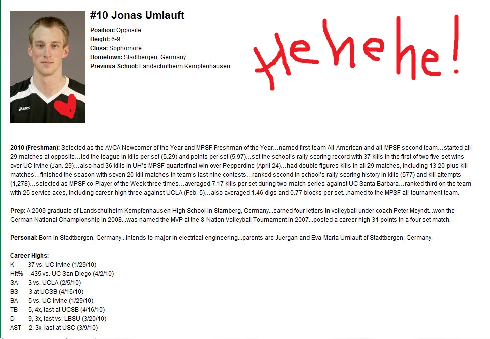 Just when we started loving the Stanford Cardinal aka The 2010 NCAA Champs then they lost in 3 straight sets against #13 ranked Warriors from the University of Hawaii. UH has this German guy named Jonas Umlauft who was almost unstoppable. Seriously! BB Jonas was having one of the best nights of his volleyball career. We hope he gets to do it over and over again throughout the season.