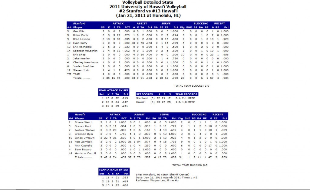 UPDATE: Stanford beat Hawaii in an epic 5 set match: 25-21, 17-25, 25-19, 34-36, 17-15. Stanford’s captain, Spencer McLaughlin, redeemed himself after a disastrous match on Friday by pounding 29 kills (career high). To READ more, click THIS.