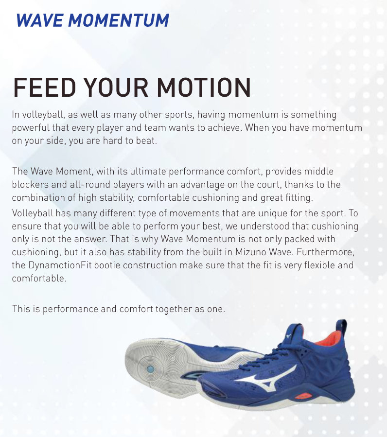 When the match gets intense, you need a volleyball shoe that can handle it. The Wave Momentum delivers the ultimate support that responds to the most intense change in stance with our Mizuno Wave technology. A bootie constructed upper made of a no-sew material creates a sleek, lightweight body providing a snug fit and elite comfort.