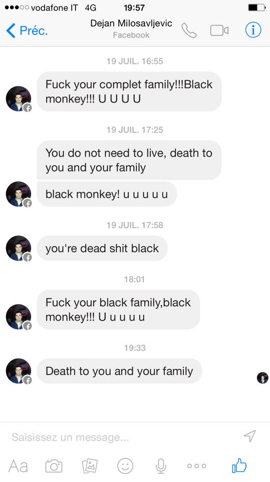 Translation: I am fed up! Following our victory against Serbia here is the message I received. As you can see from the dates, it did not just start today. I am mixed, Cameroonian-French and I proud of it. I will never stop wearing blue jersey with honor and pride. After our qualification, I wanted to share with you moments of joy and happiness but tonight I can’t. The situation is too serious and I prefer to emphasize that racism really exists. I am one of those French-African race mixed athletes who will fight until my last breath.”