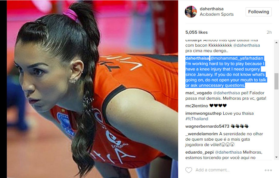 The two time Olympic gold medalist who is currently playing in Turkey with Eczacıbaşı VitrA Voleybol got annoyed when a “fan” commented something not pleasant to her ears. We’re not sure what this person wrote since he deleted his comment but we could say that it wasn’t nice based on Thaisa’s reply: