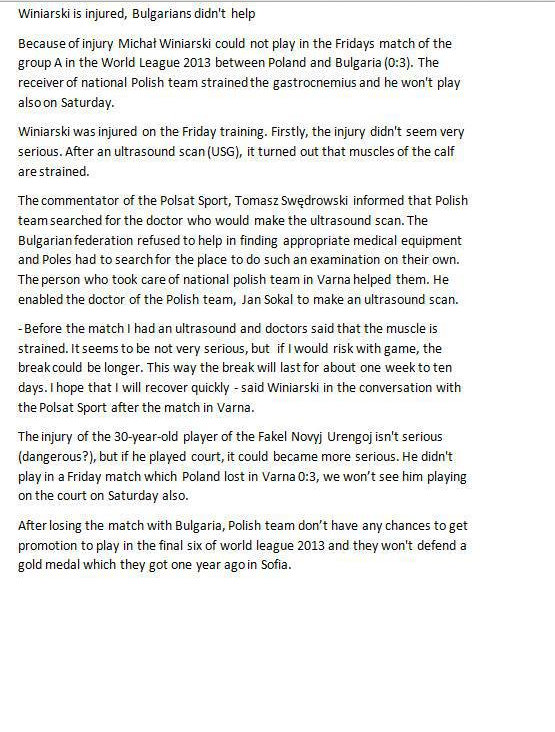 We finally have the other side clearing the air in regards to the shocking allegation that the Bulgarian Federation refused to help Winiarski seek medical help while in the city of Varna for the World League Tourney this past weekend.