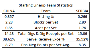 Onto defense, Serbia’s libero Popovic is digging (including dig receptions) almost 4 balls a set. Malesevic and Mihajlovic combined dig 5.4 balls between them too. For China, their libero Li Lin is a little worse than Popovic at 3.6 digs a set. Ting and Gong are also a little worse at 5.2 digs per set.