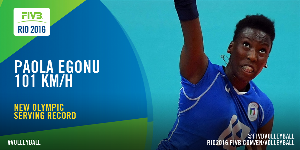 Paola Egonu of Italy owns the Olympic record for fastest serve at the end of women’s volleyball fourth round of play at the Rio 2016 Olympic Games.