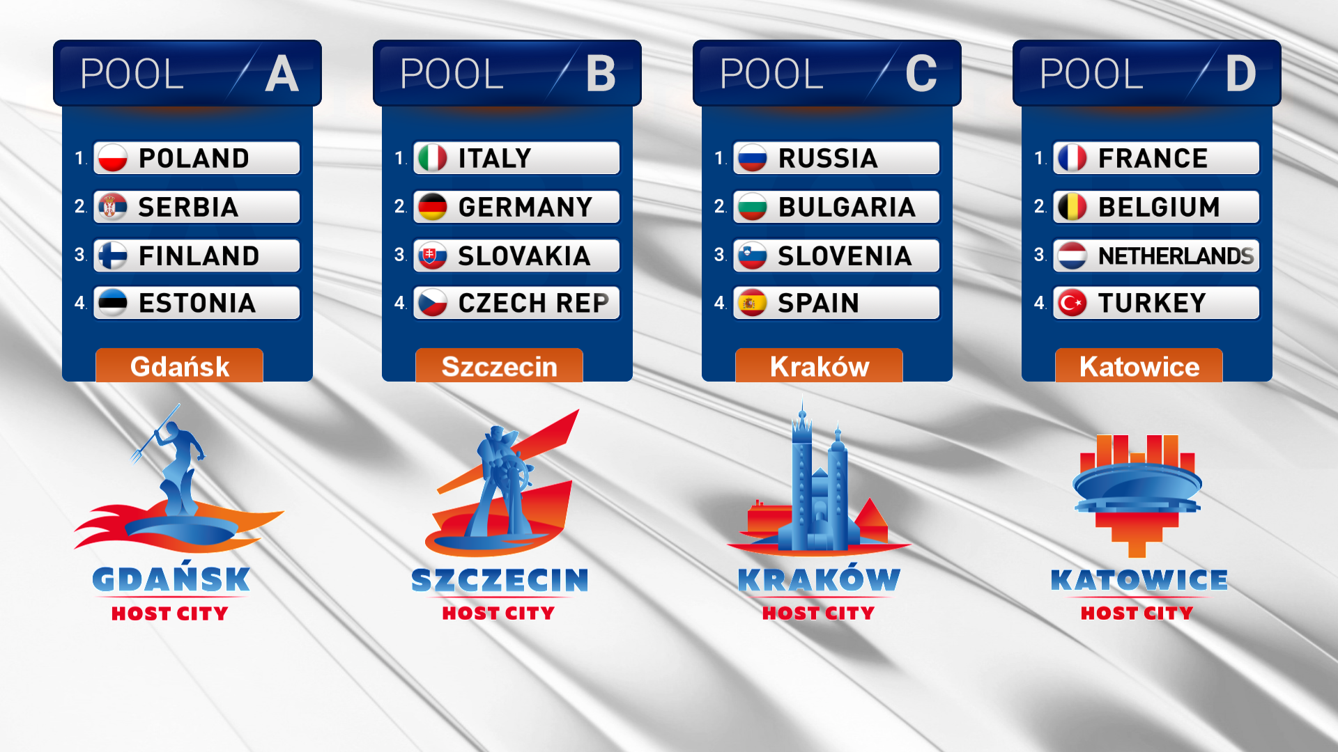 Besides host country Poland, the national teams of Italy, Russia and France were seeded as head of Pools A, B, C and D respectively. The hosts of the tournament will be joined by Serbia, Finland and Estonia in Gdansk. In Pool B which will be contested in Szczecin, the national teams of Germany, Slovakia and Czech Republic were drawn to join Rio 2016 silver medallists Italy while the Russian team will face 2015 EuroVolley silver medallists Slovenia along with Bulgaria and Spain in Krakow in Pool C. 2015 gold medallists France will get the chance to defend their title starting this challenge against Belgium, The Netherlands and Turkey in Pool D in Katowice.